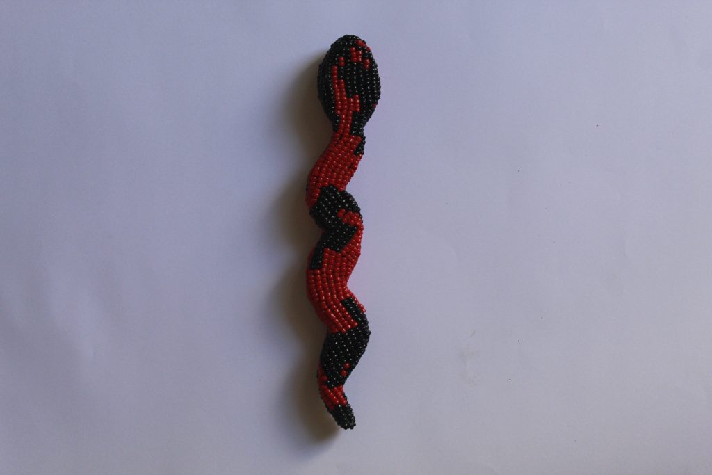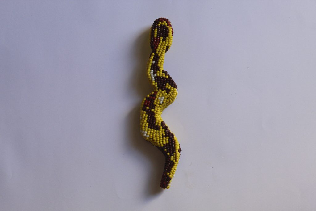A obra “Uma filhote de Dan, já é uma Dan” apresenta uma trindade de Dans filhotes, inseridas na série contínua Andem com as Cobras, elas sabem morrer. Esta série dialoga com cosmologias africanas, especialmente com os saberes filosófico-espirituais dos povos Fon e Nagô, nos quais a serpente, conhecida como Dan, é símbolo de sabedoria, transformação e ancestralidade viva.