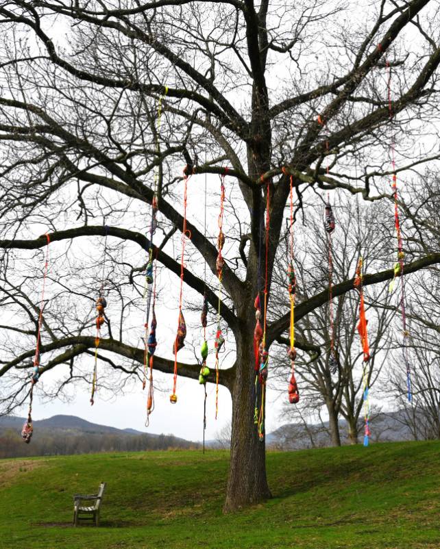 Dentro das galerias, uma seleção de obras de Gomes, abrangendo toda a sua carreira, destaca sua abordagem transformadora à escultura. Costurando, encadernando e tecendo, Gomes dá nova vida a materiais doados e descartados, imbuindo-os de significado pessoal e cultural. Esculturas em tecido ricamente texturizado e montagens de madeira, arame e linha transmitem uma sensação de intimidade e conexão, como se o toque da artista permanecesse em cada dobra, nó e ponto — convidando os espectadores a refletir sobre as histórias embutidas nos próprios materiais.