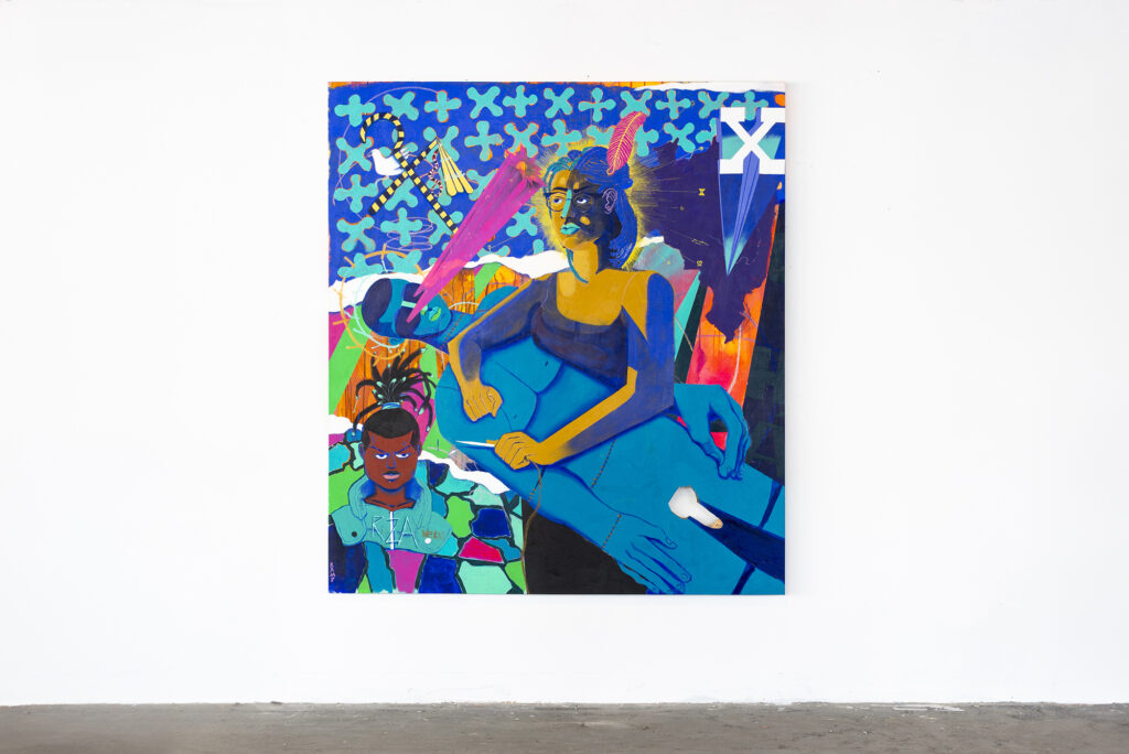 “Pesquiso os desdobramentos do verbo Construir e a sacralização, confecção e o restauro de espaços radicalmente pretos.” (texto do artista).